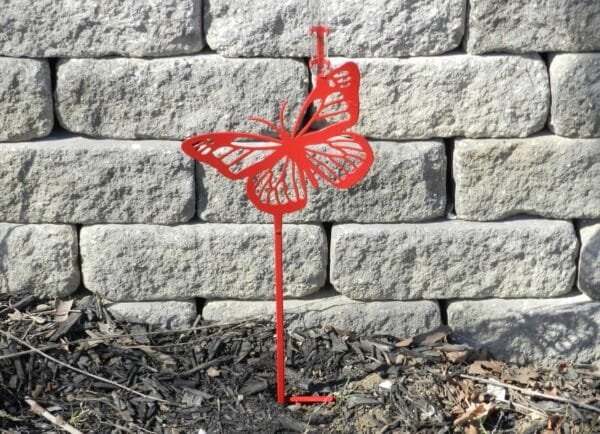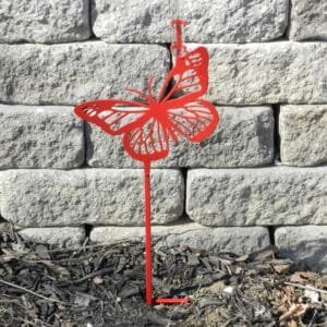 A decorative metal rain gauge holder with a butterfly design. Glass rain gauge tube is included.